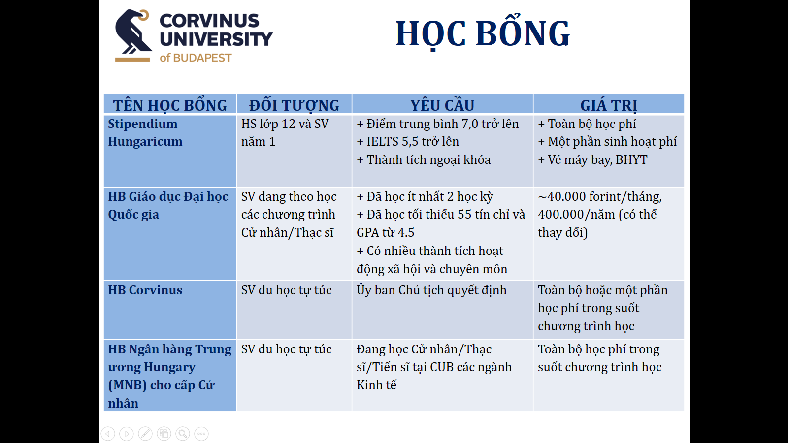 - Corvinus University Of Budapest ( Gọi tắt là CUB) có học bổng toàn phần của chính phủ Hungary, bao gồm toàn bộ học phí & sinh hoạt phí, bảo hiểm, vé máy bay