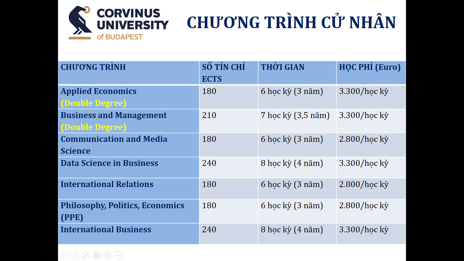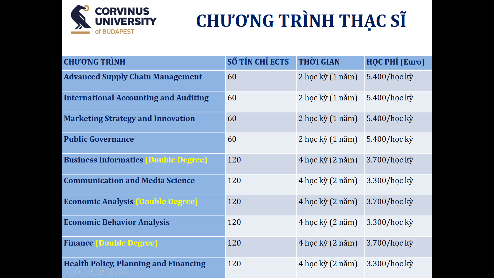 - Học phí: 5.000 Euro (chương trình 2 học kỳ)