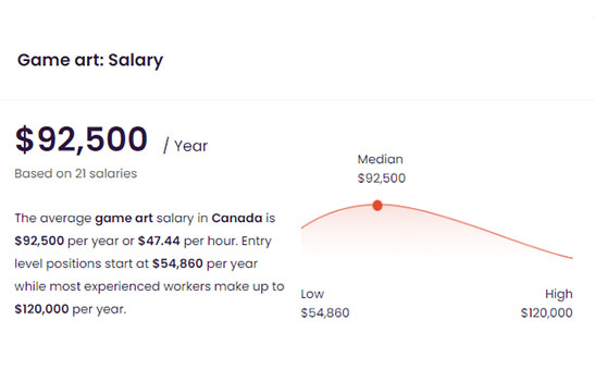 Mức lương trung bình của một nhân sự làm việc trong lĩnh vực game ở Canada là 92.500USD/ năm. Tùy vào trình độ và kinh nghiệm mà mức lương của các bạn sẽ dao động từ 54.860 USD đến 120.000 USD/ năm.